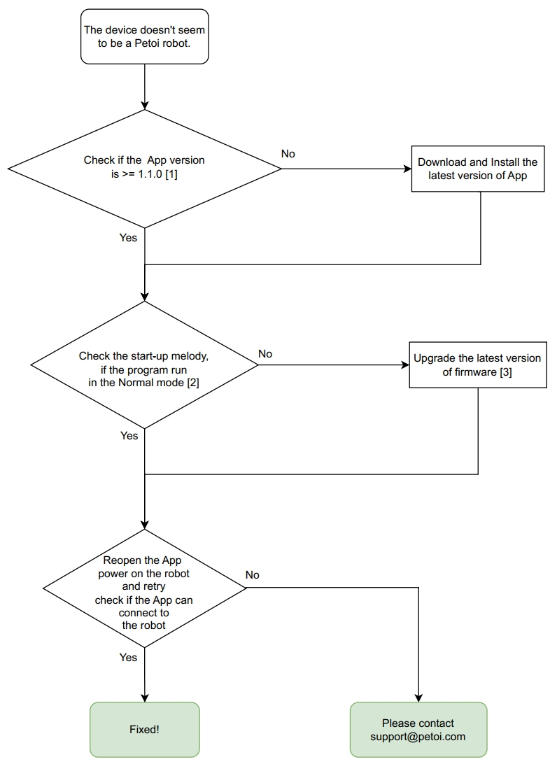 When connecting, the app will send handshake signals to the robot, and the robot should be running the firmware in standard mode to respond correctly. If the app returns a "not Petoi robot" error, it's probably due to a firmware issue. Please follow this debugging process: