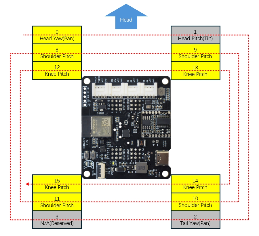 Although the BiBoard V1 has only 12 pins, the joint index numbers are configured in the same order as the NyBoard. The ordering for the joint servo pins on BiBoard V1 is like below: