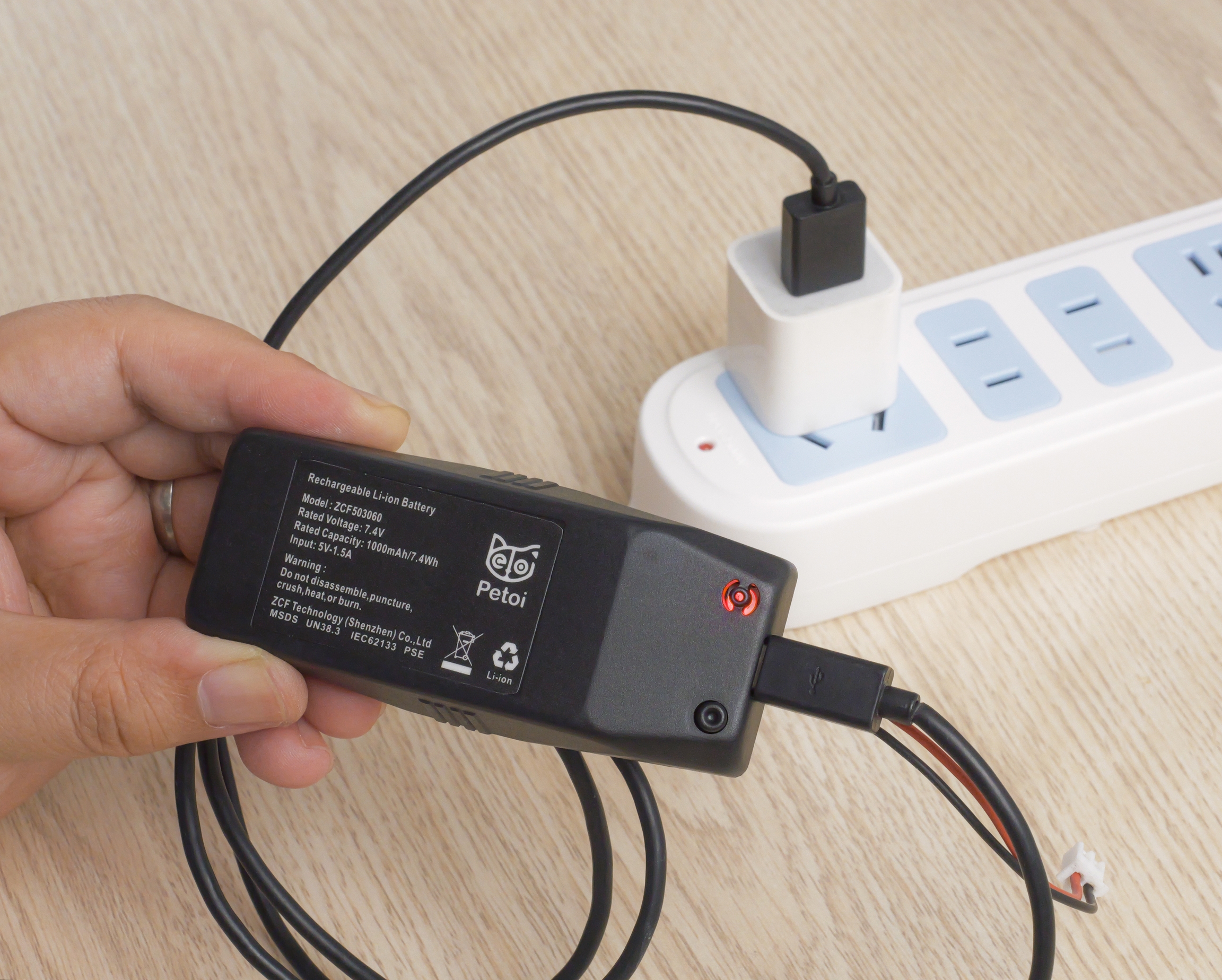 Use a 5V-1A USB charger to charge the battery. We don't recommend using fast chargers. The battery will NOT supply power during charging. Keep the battery in your sight when charging.